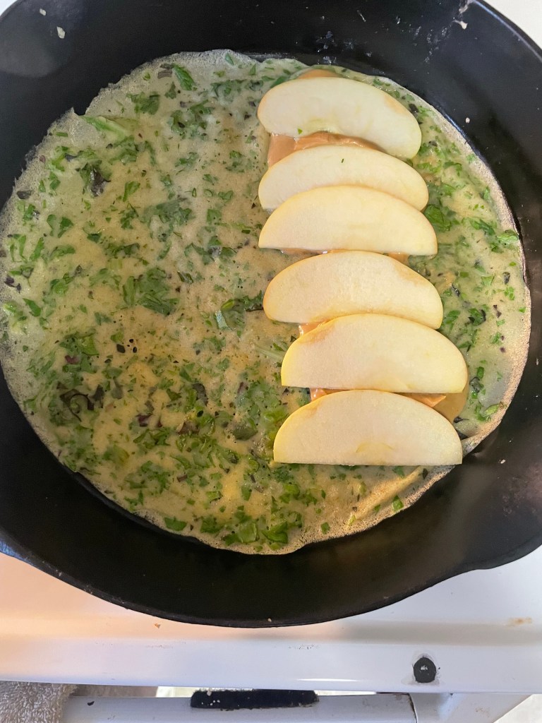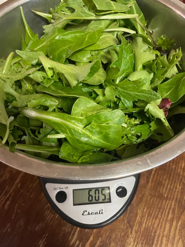 Finely chop greens and add in the spinach/spring mix into the batter right before using. Now before you come at me about this, look at how many beautiful greens (scale reads 6 oz because triple the recipe) and how nicely they mix in with the batter. This is totally a mom/dad win. My kids (and other picky family members) approve of this. For all you responsible adults who eat greens on the side, well… good for you.