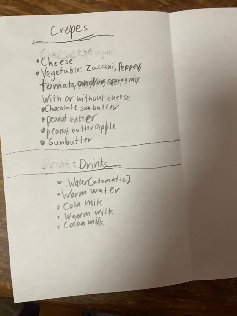 Here’s a “menu” my kids made making them feel like they are ordering at a restaurant and making meal time more fun and interactive.