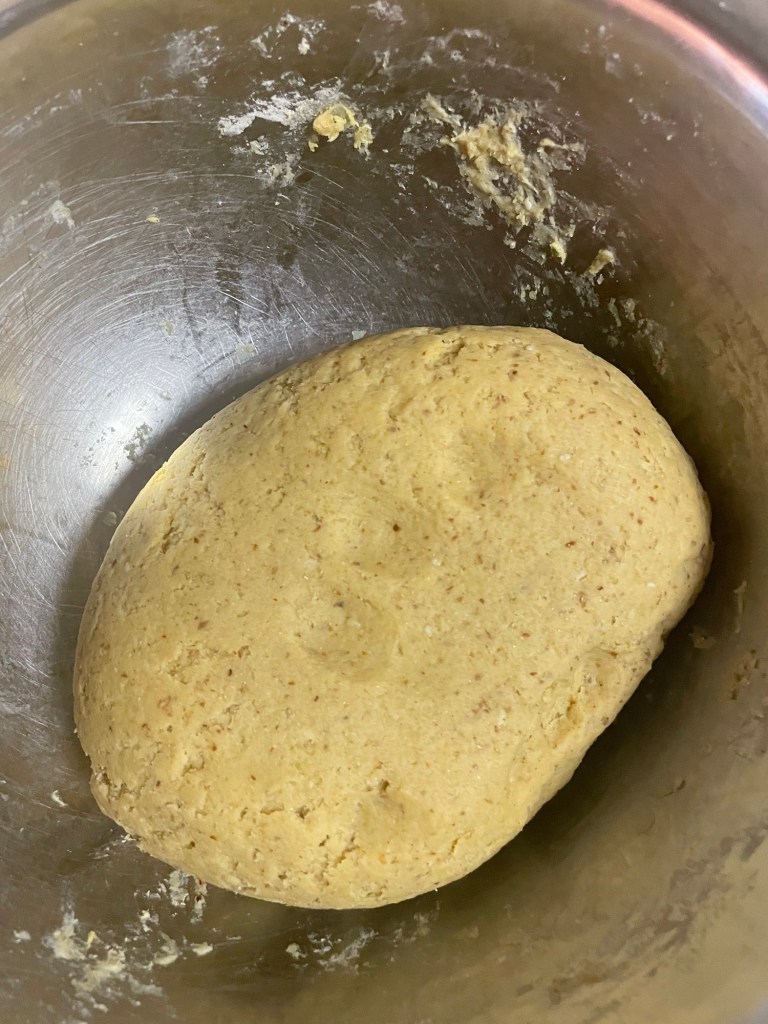 Take a small ball of dough, flatten it with the palm of your hand and roll it with a rolling pin.