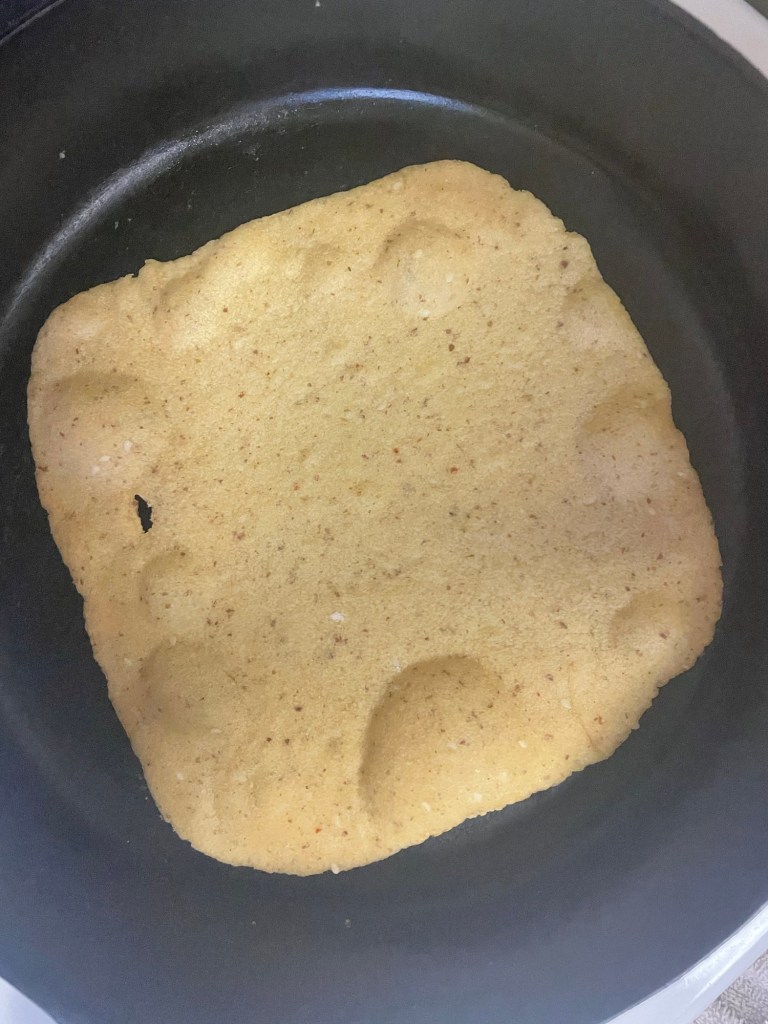 If the flatbread won’t be eaten right away, add some oil to the top of the flatbread right before the first flip. If it will be eaten immediately, this is not necessary. Flip again and cook more on original side if necessary – until there are nice brown dots everywhere.