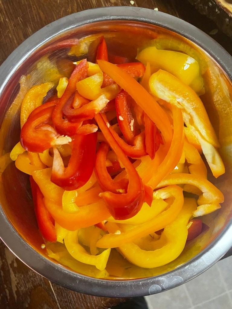 Cut bell peppers into long slices