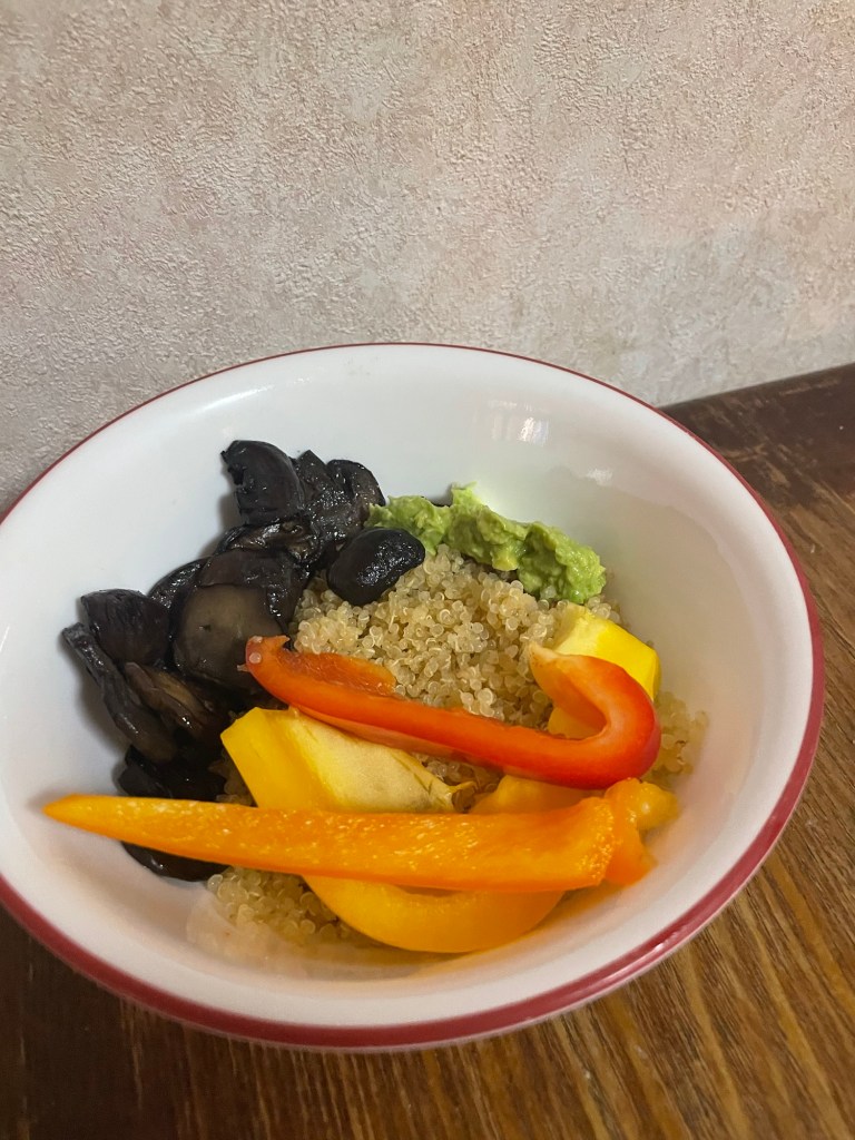 Start with quinoa base. Add toppings on top (avacdao, mushrooms and peppers).