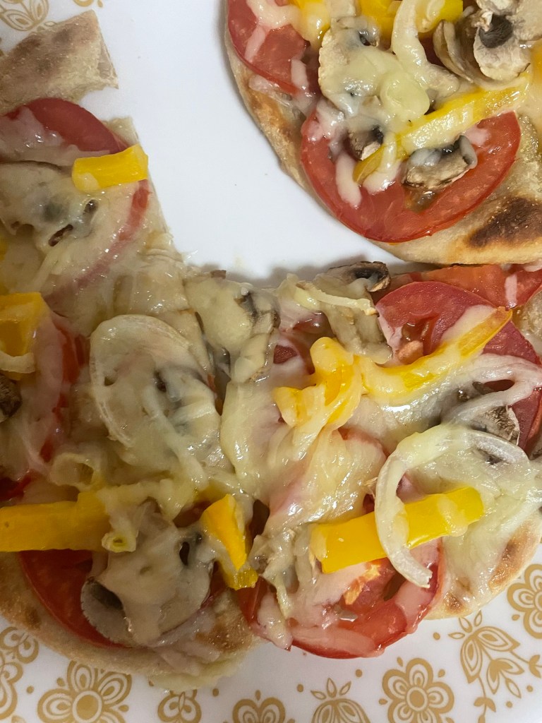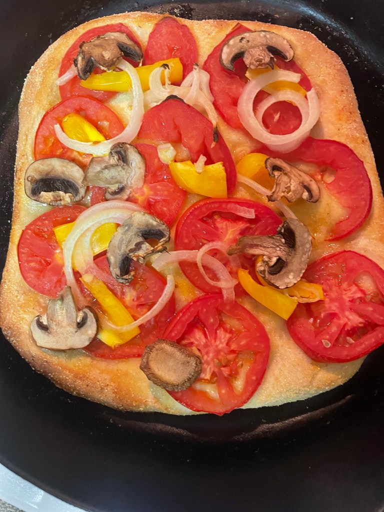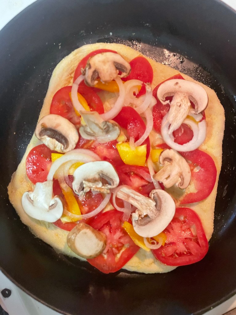 Add salt on top and bake in the oven for around 10 minutes – the veggies should be slightly cooked and the crust has a light brown.